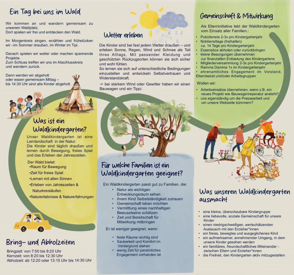 Der Aufenthalt im Freien unterstützt die körperliche und seelische Gesundheit der Kinder. Primärerfahrungen aus erster Hand fördern das Körperbewusstsein und verhelfen der Entfaltung vielfältiger Wahrnehmungs- und Bewegungsfähigkeiten. Im gemeinsamen Spiel mit natürlichen Materialien entwickeln die Kinder in besonderer Weise Kommunikationsfähigkeit, Hilfsbereitschaft, Ausdauer, Geduld, Phantasie und Kreativität. Durch eigenaktives, entdeckendes, möglichst ganzheitliches Tun, lernen die Kinder die Komplexität der sie umgebenden Welt kennen und erweitern so ihr Wissen.
